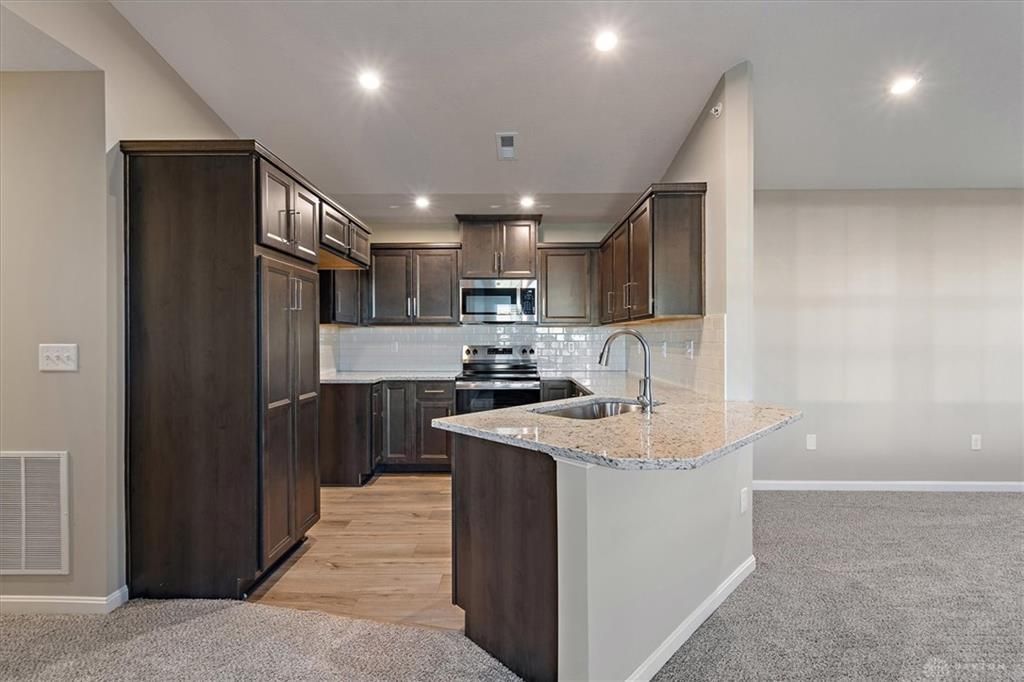 Trendy new Kimbell plan by Fischer Homes in beautiful Majors at Shaker Run featuring a penthouse style condo. Gorgeous U shape kitchen with upgraded multi-height maple cabinetry with soft close hinges, and gleaming granite counters and is open to the oversized family room with cathedral ceiling. Owner's suite with en suite bath and walk-in closet. Additional bedroom and hall bath.