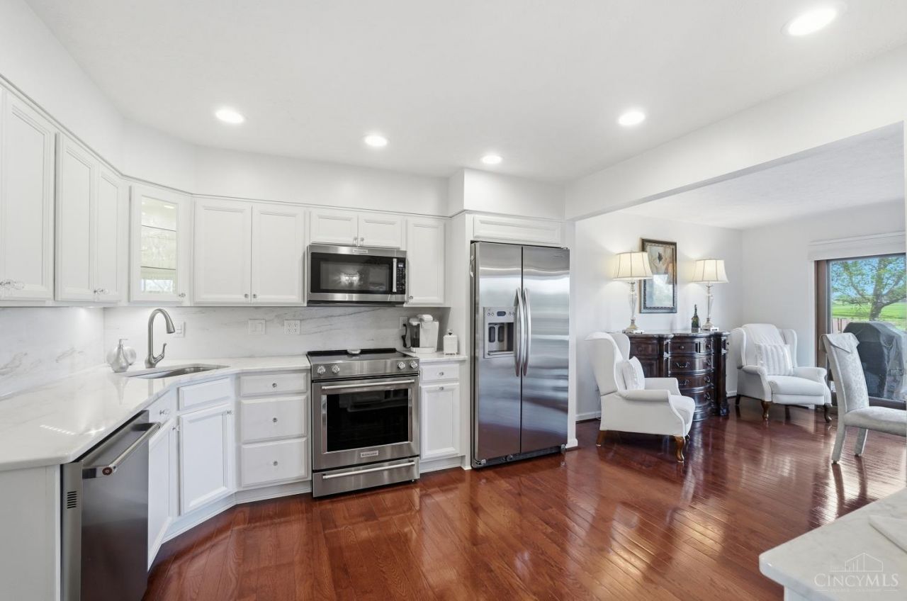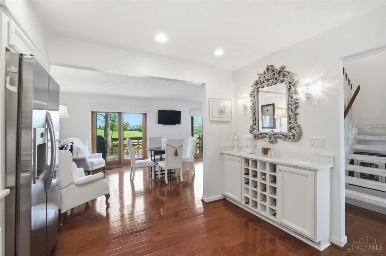 Once you enter this well appointed move in ready condo, you notice a high level of upgrades the current owner has made from the beautiful hardwood floors, custom painted powder room to the Kitchen cabinet's, built-in pantry and bar, solid surface counter tops and backsplash. The living and open dining room welcomes you with an expansive view of the Grizzly golf course. The large deck is great for entertaining and has additional landscaping viewing the 3rd tee box and a park like setting. At the top of the stairs you'll find the spacious owners suite and large full ensuite bath, whirlpool, and plenty of closets space, plus a great view of the golf course. The guest suite offers an additional full updated bath. You'll enjoy the finished lower level family room with a bar and storage space. 1 car garage and plenty of additional parking available. Conveniently located, to I-71, Shopping, restaurants, schools, Kings Island and much more. Don't wait, this unit is expected to sell fast.