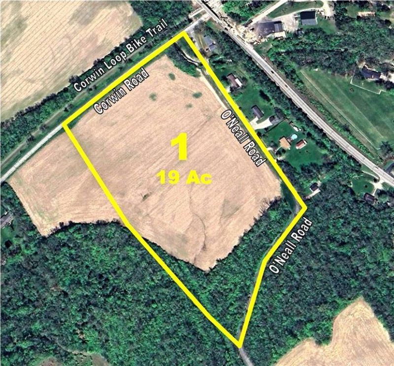 Tract 1: 19 acres of rolling farm and woodlands with 2,496 feet of road frontage at the corner of Corwin Rd and O'Neall Rd, providing excellent lot split potential just outside the Villages of Corwin and Waynesville and less than 4 miles west of Caesar Creek Lake & State Park. This well-located building site features approximately 2.5 acres of woods and is located directly across the road from the Corwin Loop Public Bike Trail leading from Waynesville to Morrow and beyond. This is a great opportunity for your own mini-farm with plenty of room for horses, livestock, and other country fun! The property is zoned R-1 (Residence Single Family) with nearly a half-mile of road frontage on Corwin Road and O'Neall Road, providing excellent investment potential to subdivide into multiple building lots with the Township's minimum lot requirements of 2 acres and 150' of road frontage. The property has been newly surveyed and is ready to build with public water available along Corwin Rd. Great scenic location less than 10 miles from Lebanon, Centerville, Springboro & surrounding areas and only 13 miles from I-71 for an easy commute to Cincinnati. This is one of 5 neighboring lots available on Corwin Rd and O'Neall Rd ranging from 6 to 19 acres. Great opportunity to purchase one or more neighboring lots to suit your family's needs. Call today for full details or to schedule a visit. Waynesville Schools.